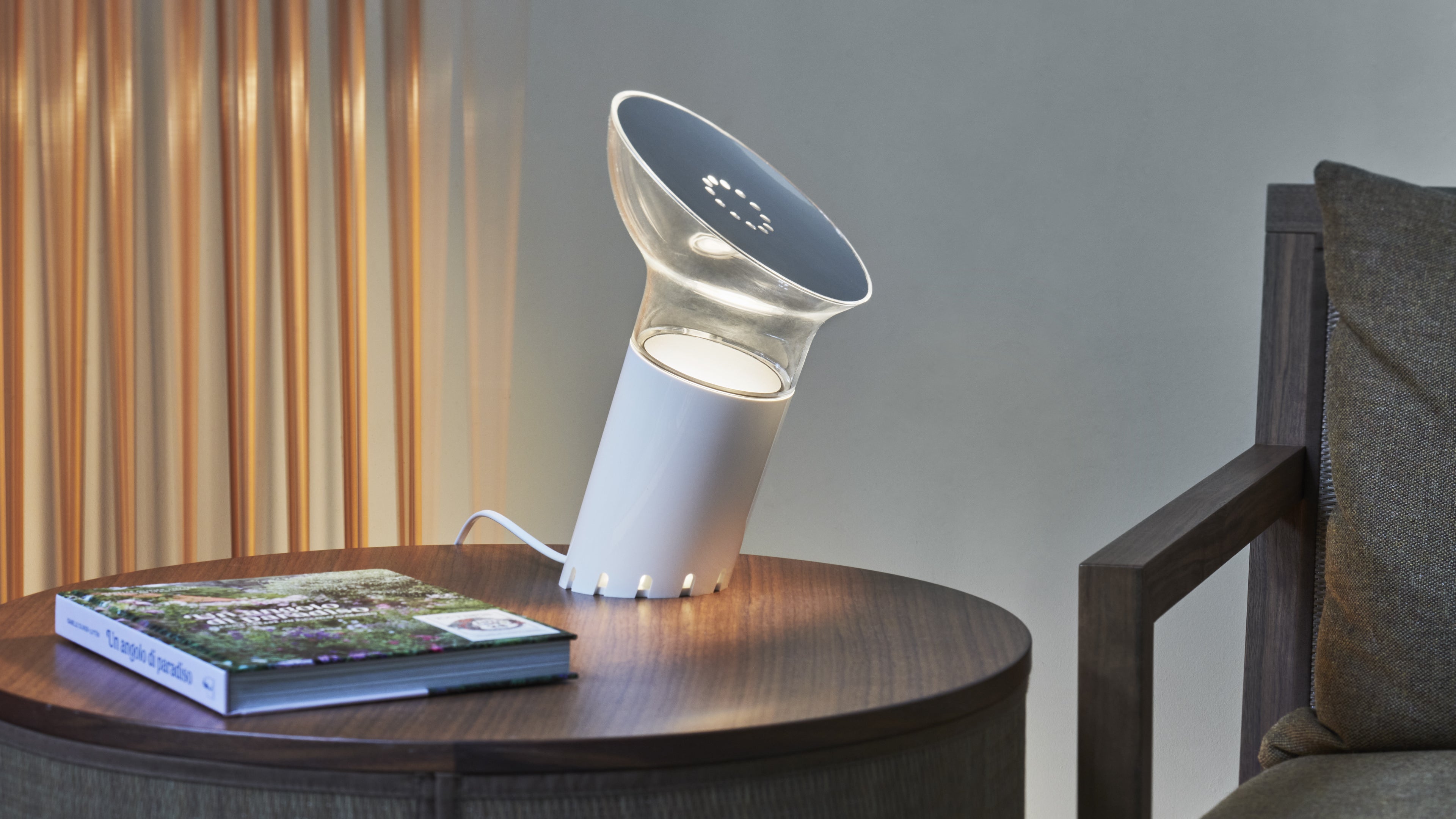 NITIA is a small table lamp with reflected light made of plastic and steel. The design is characterised by a static game and an unexpected formal composition of overlapping volumes.
