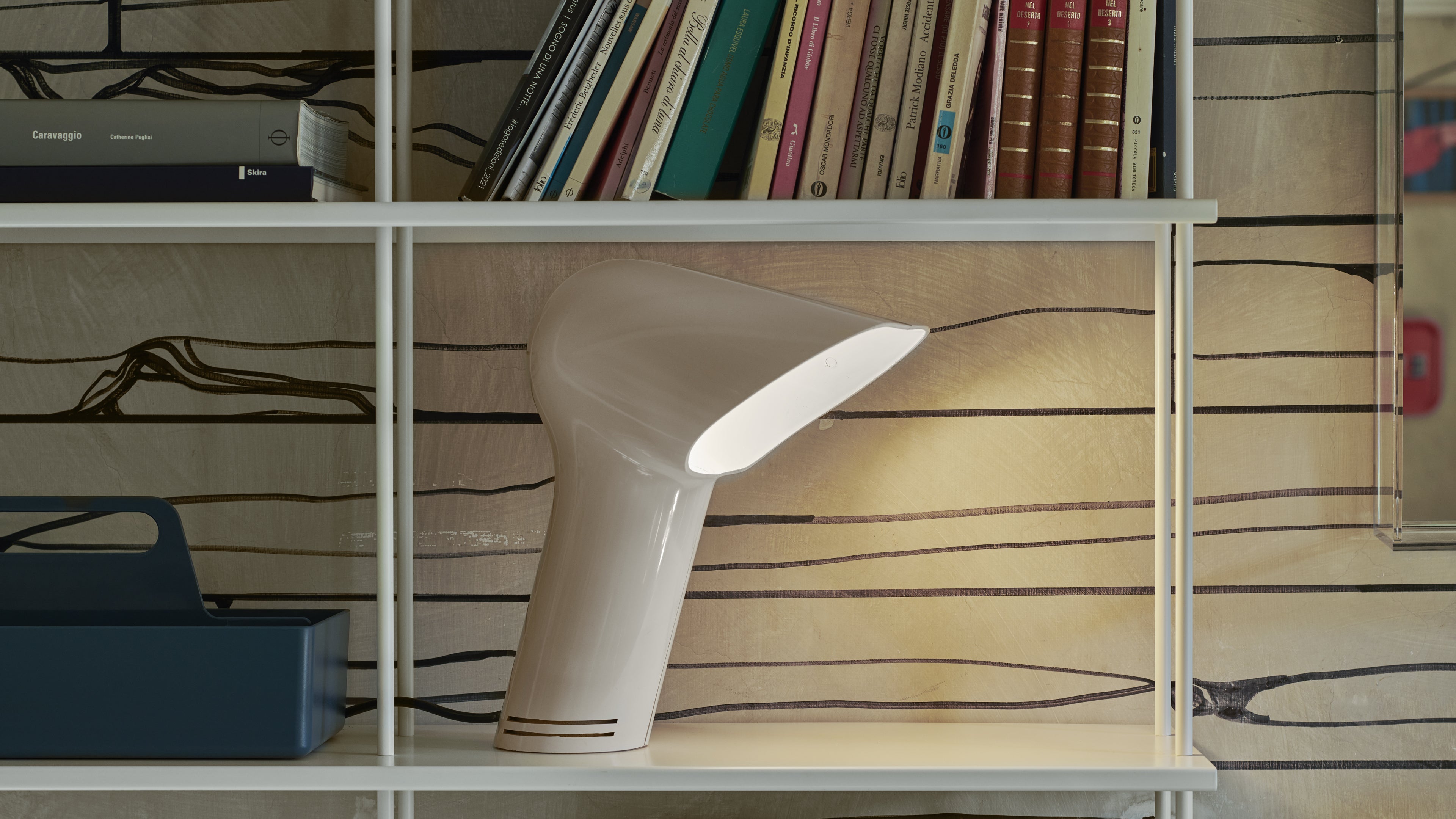 SORELLA è una lampada da tavolo di dimensioni compatte, una forma aggettante, apparentemente instabile. Due parti simmetriche si uniscono al centro del corpo per riprodurre la complessa e elegante forma svasata del paraluce.